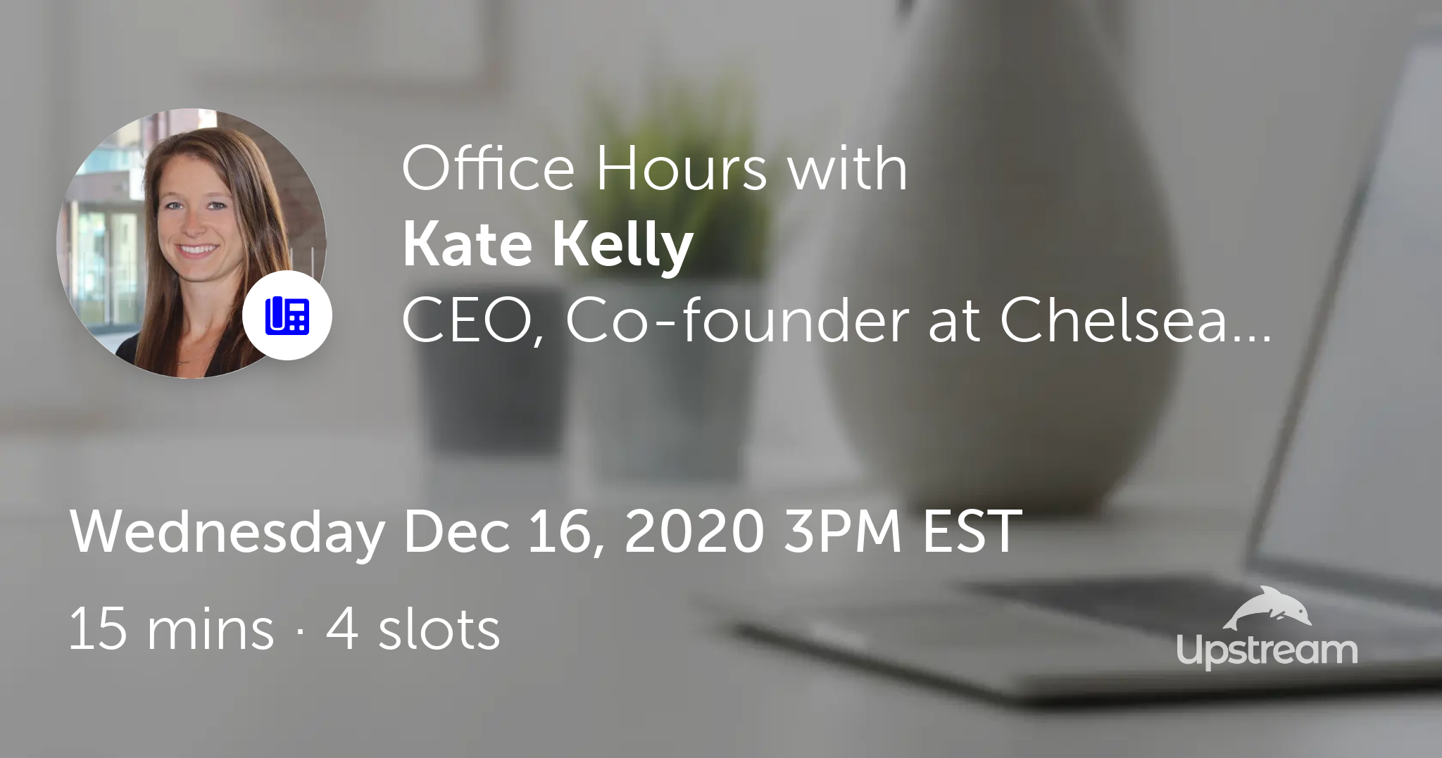 Kate Kelly is hosting Office Hours on Upstream on Wed Dec 16, 2020 3PM EST.