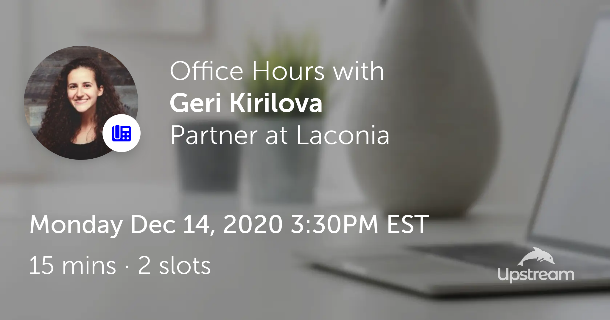 Geri Kirilova is hosting Office Hours on Upstream on Mon Dec 14, 2020 3:30PM EST.