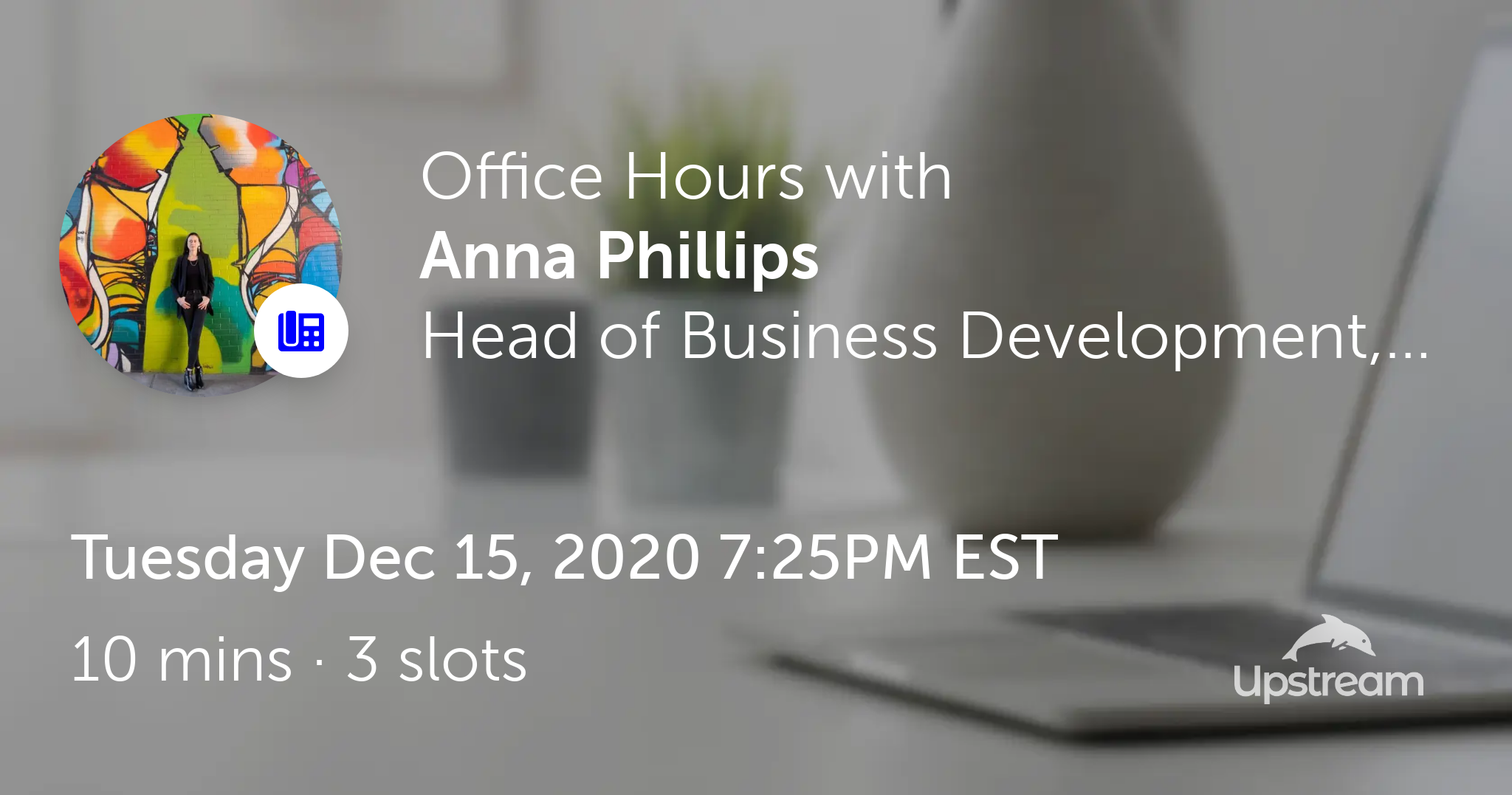 Anna Phillips is hosting Office Hours on Upstream on Tue Dec 15, 2020 7:25PM EST.