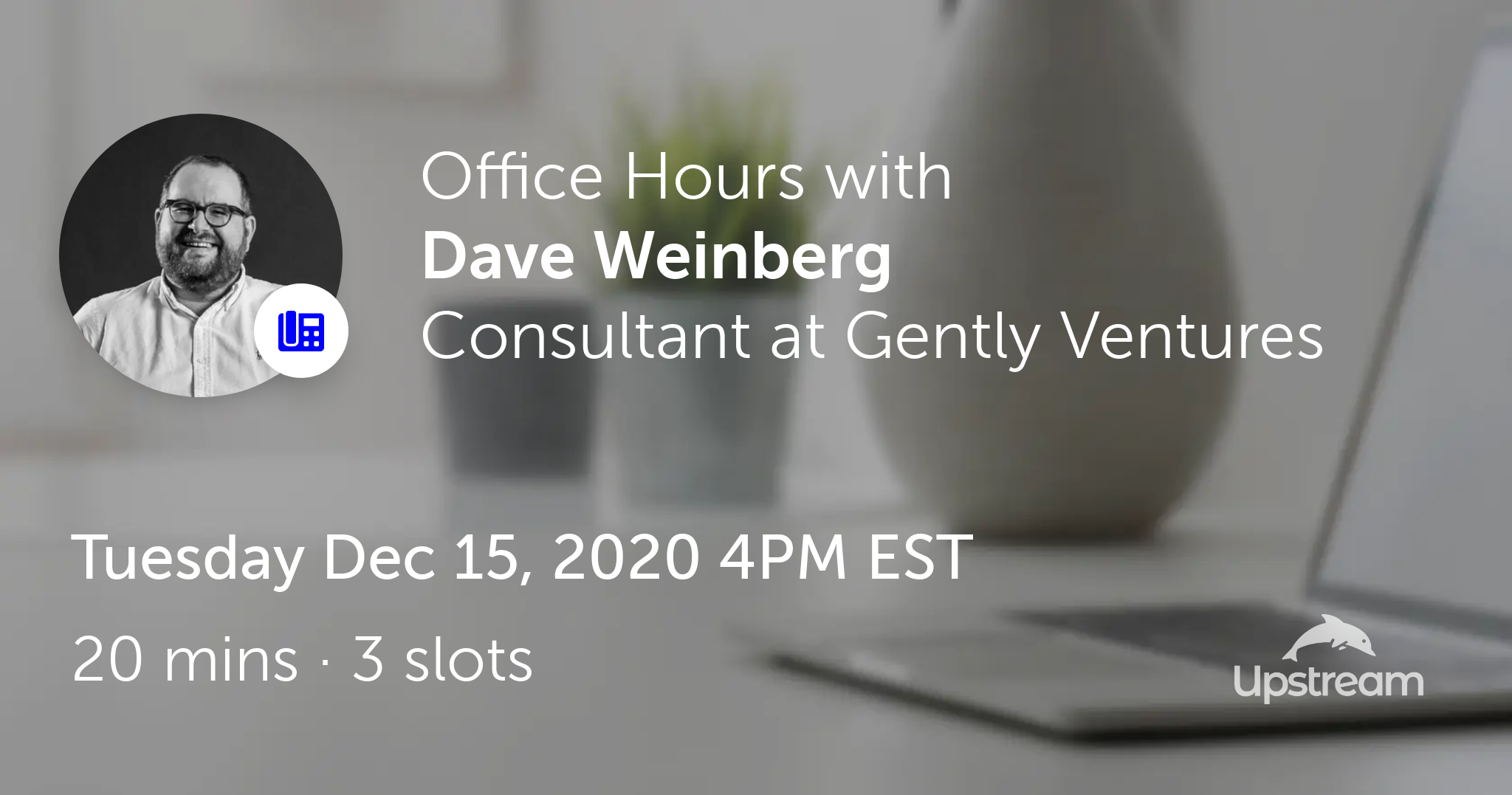 Dave Weinberg is hosting Office Hours on Upstream on Tue Dec 15, 2020 4PM EST.