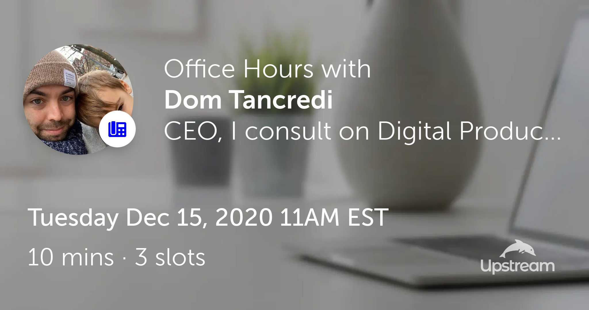 Dom Tancredi is hosting Office Hours on Upstream on Tue Dec 15, 2020 11AM EST.