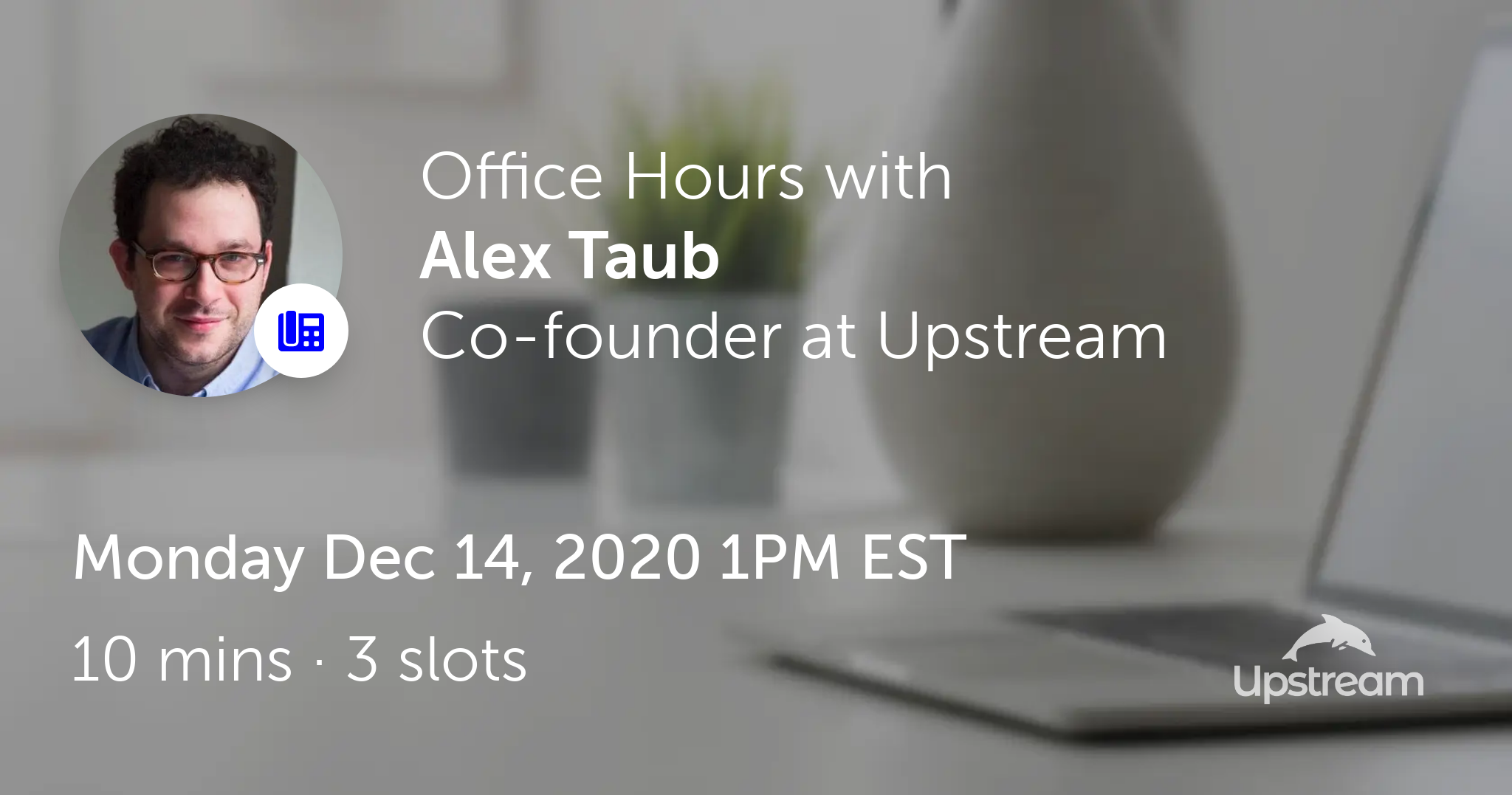 Alex Taub is hosting Office Hours on Upstream on Mon Dec 14, 2020 1PM EST.