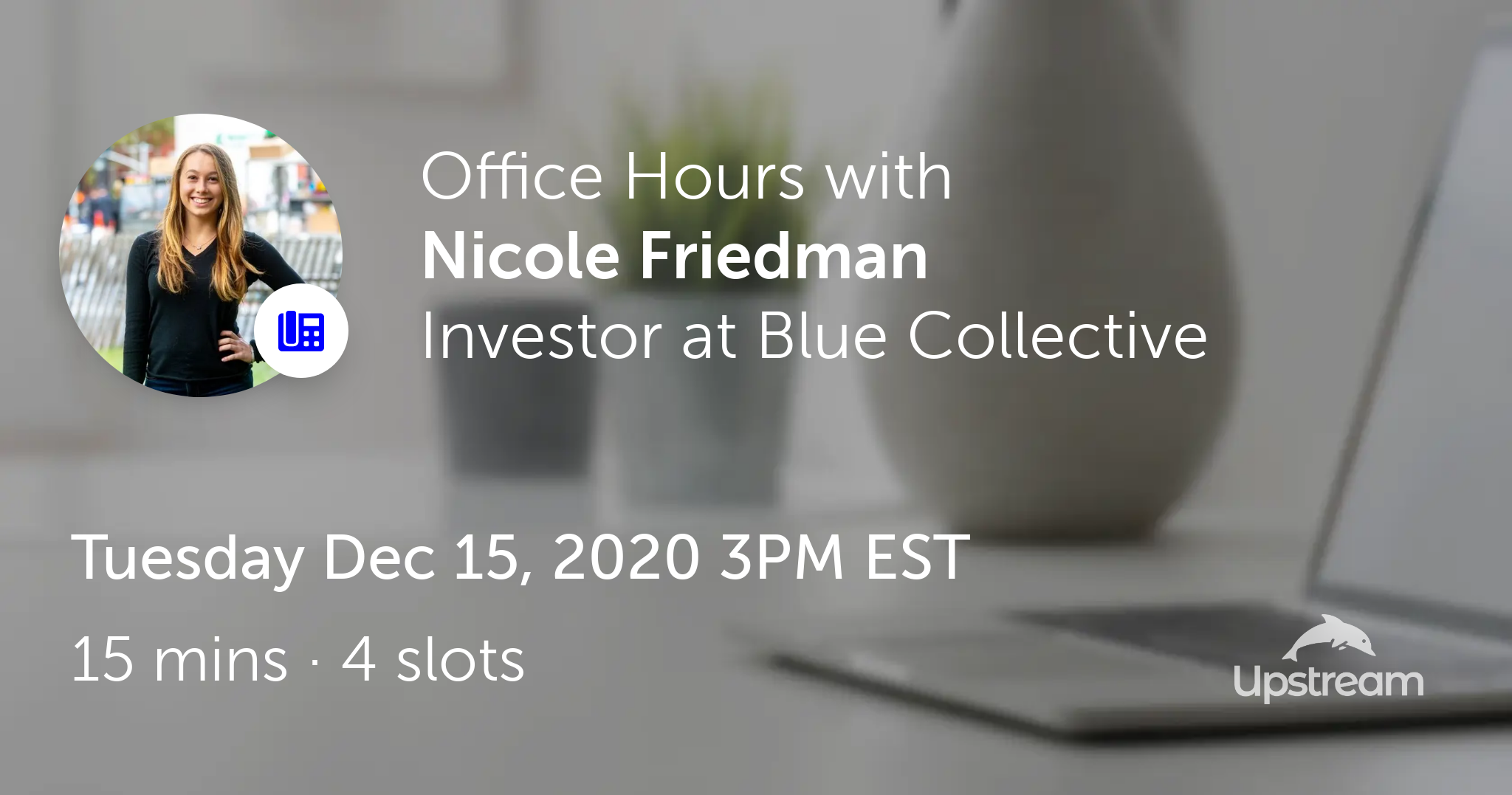 Nicole Friedman is hosting Office Hours on Upstream on Tue Dec 15, 2020 3PM EST.