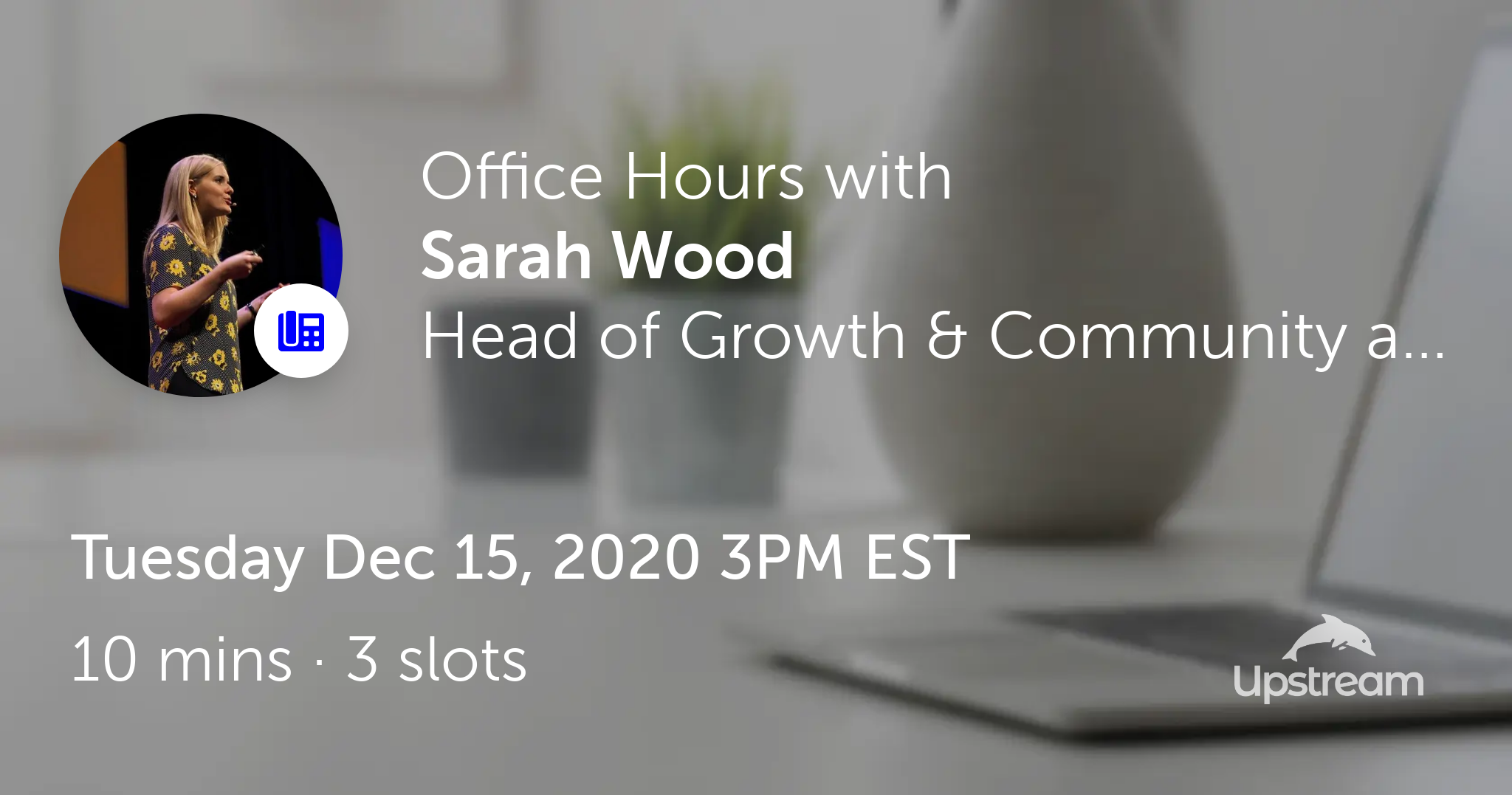 Sarah Wood is hosting Office Hours on Upstream on Tue Dec 15, 2020 3PM EST.
