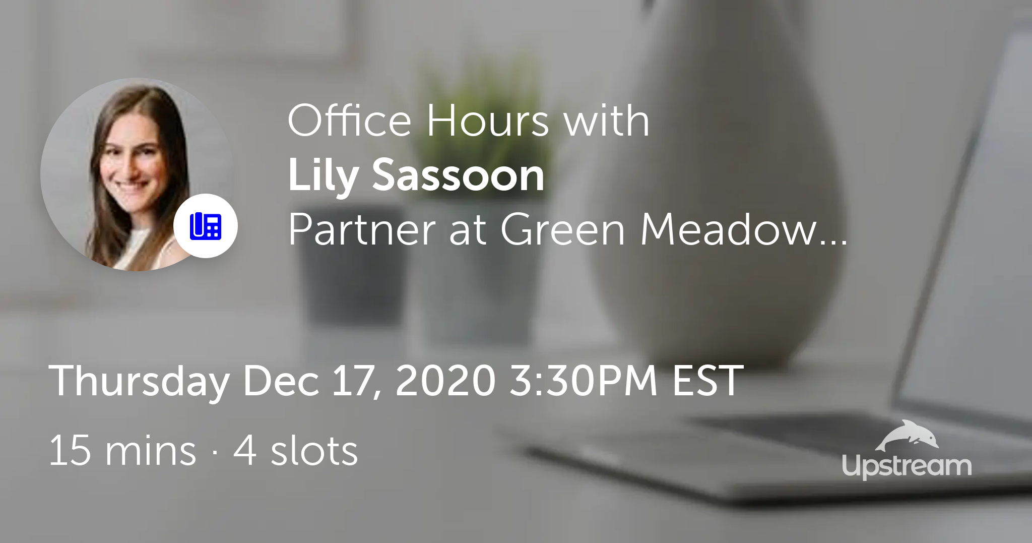 Lily Sassoon is hosting Office Hours on Upstream on Thu Dec 17, 2020 3:30PM EST.